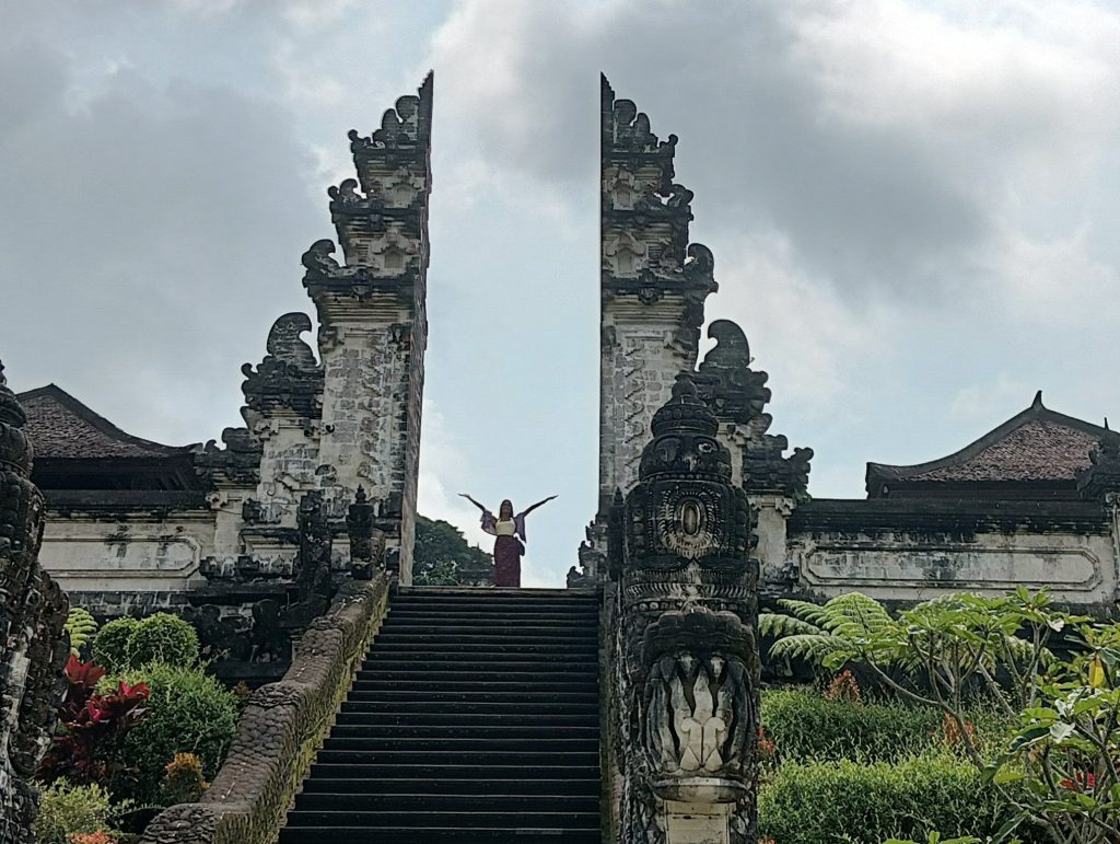 続きまして「天空の寺院」としてインスタで人気のランプヤン寺院。晴れていれば割れ門の向こうにアグン山が正面に見えます。門の中央に立って写真を撮ってもらうのは長蛇の列。平均2時間待ちだそうです💦
