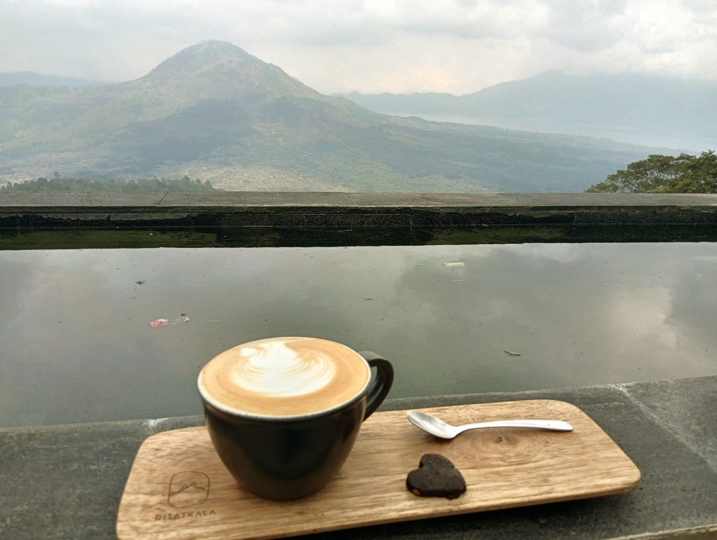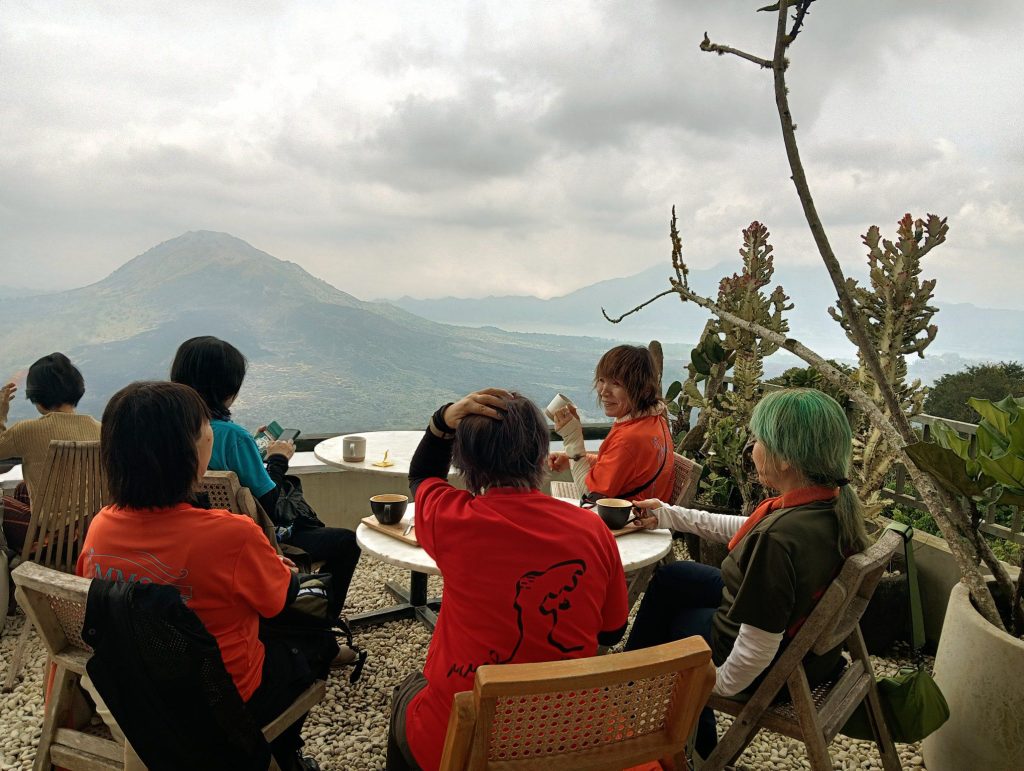 巨大なカルデラ地形のバトゥール湖を眺めながらのカフェタイム。バリ島ツーリングのお約束ポイントにもなってます。
