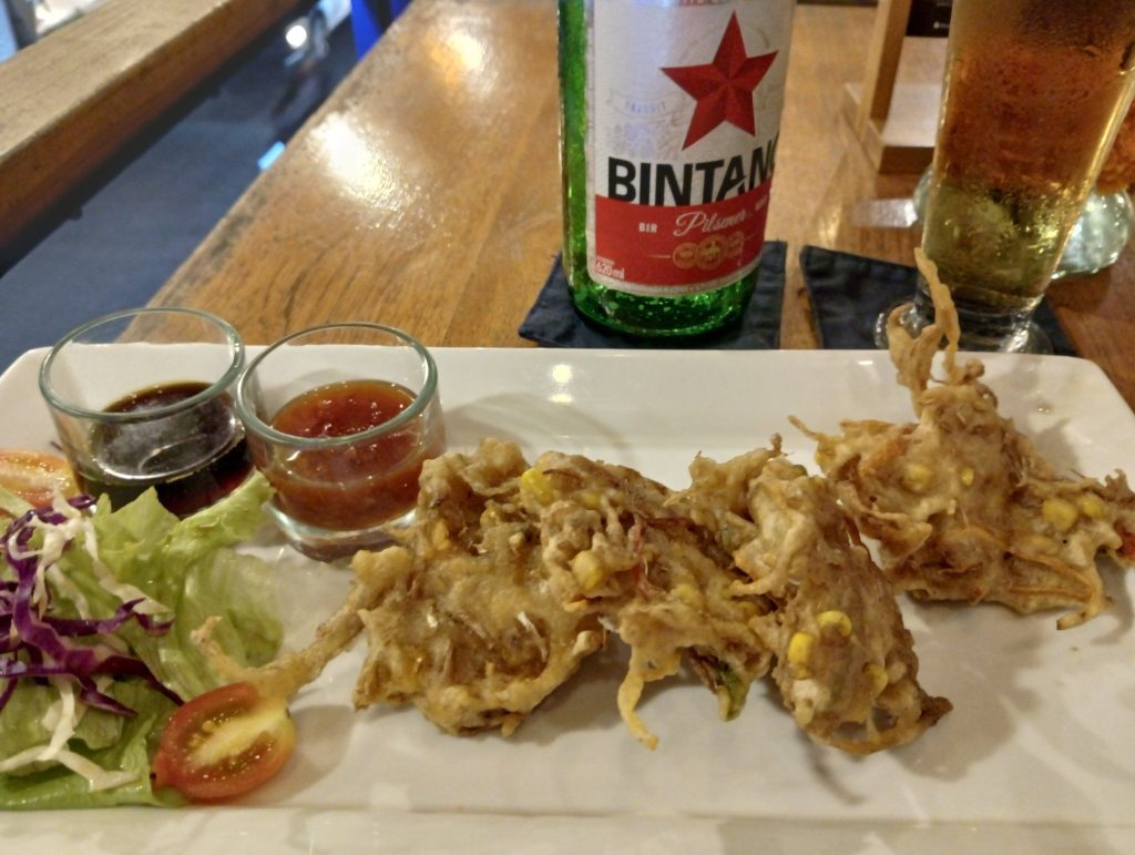 スコールの雲の端っこに引っ掛かったみたいで、急に雨が💦ちょうどフルーツ屋があったので、バナナをいただきながら雨宿り。