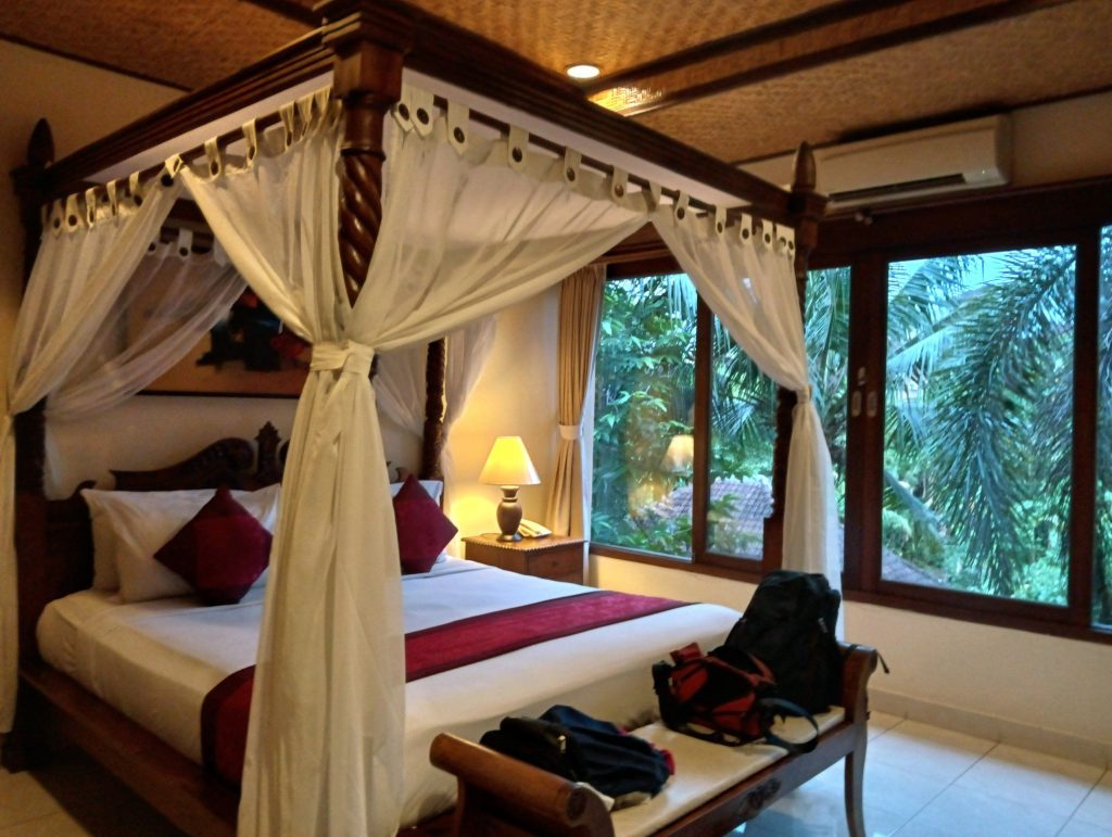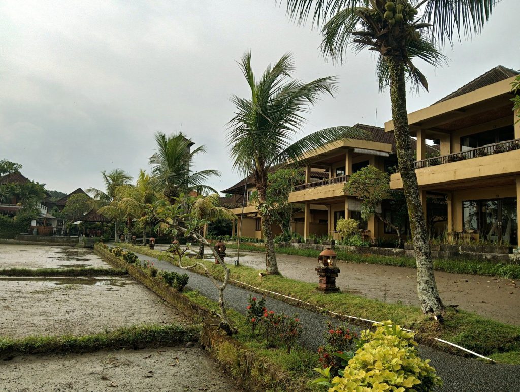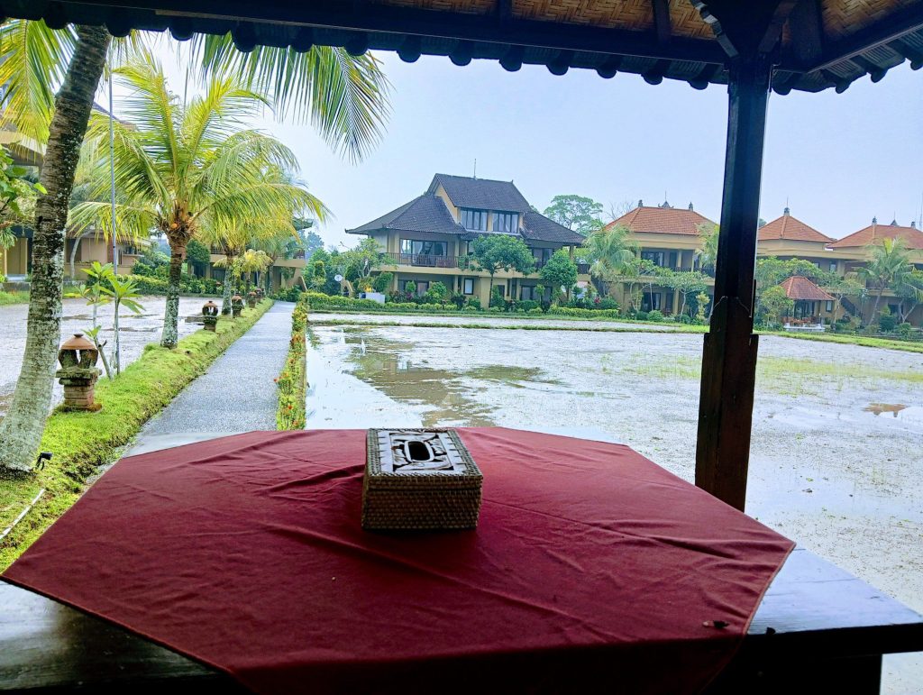 ウブドの町の中心は車とスクーターのカオス状態ですが、一歩ホテルの敷地に入ると、ここが町の中心とは思えない風景が広がっていました。ジャングルの向こうに田んぼが広がり、その向こうに私達の部屋があります。