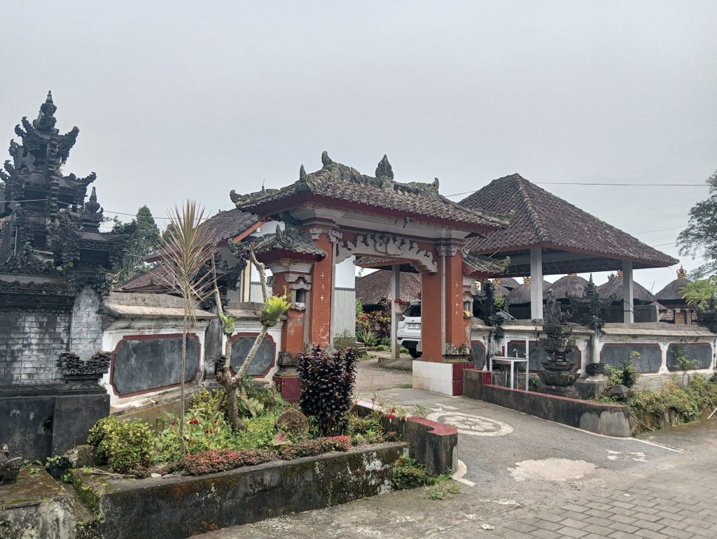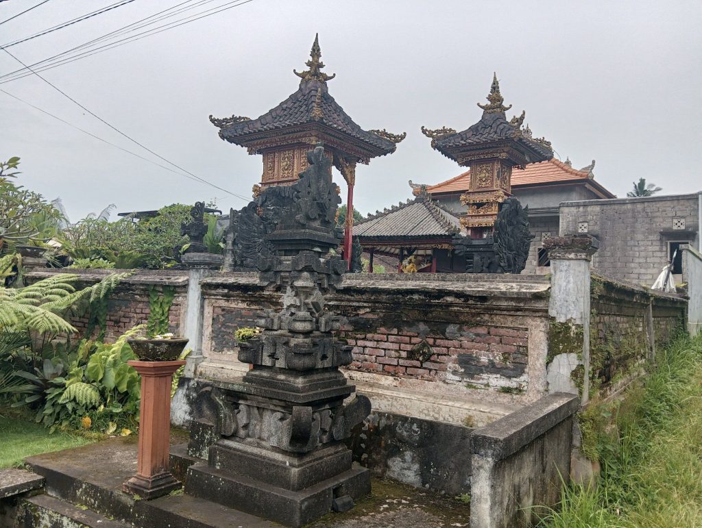 周辺の家は全部お寺のように見えます。バリ島のどこでも見られる風景ですが、町から少し田舎に入ると、お寺なのか住居なのかわからない風景がどこまでも続きます。住民の方に尋ねたところ「寺院ではなく一般住居だ、でも家の中に小さなお寺がある」という答えをいただきました。生活の身近なところに神様がいる、どこにいっても神様がいる。神々の島、という名はこんなとこからも来てるんだな、と思いました。