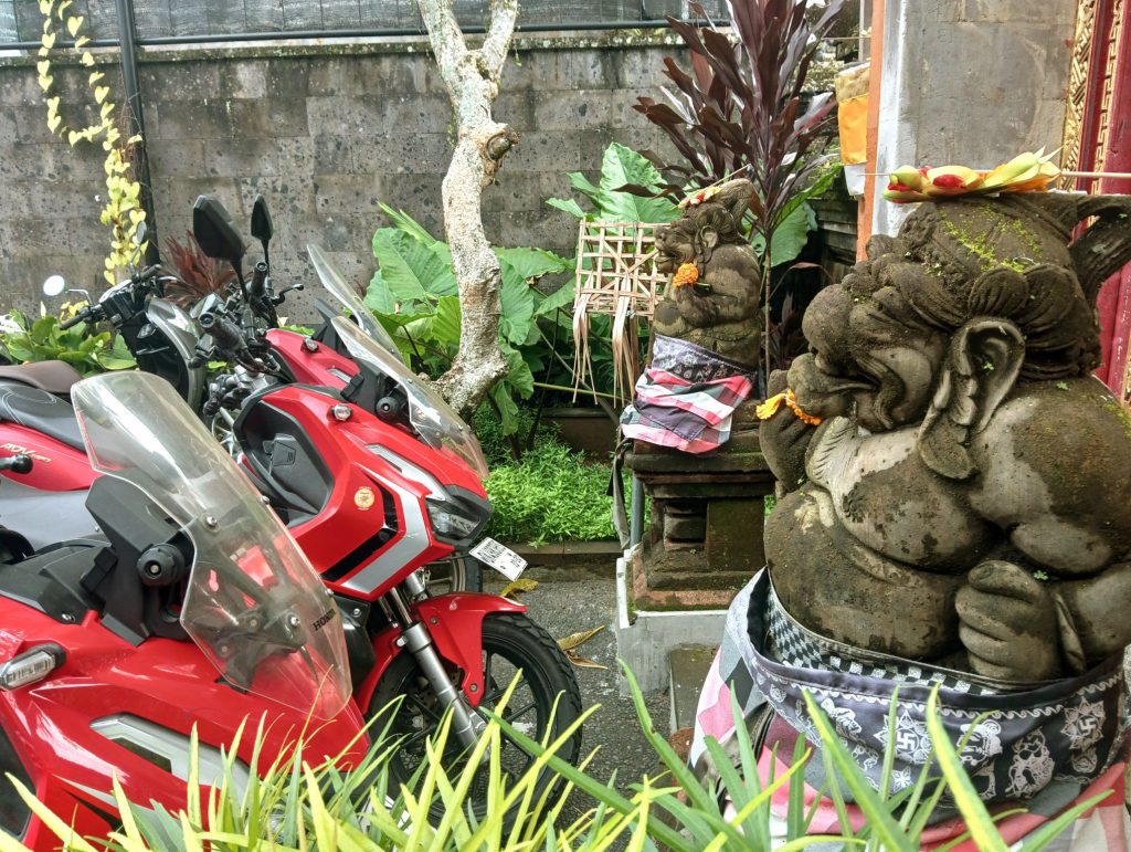 ホテルの正面玄関に止めさせてもらっている私達のバイク。どこを見渡しても神様に見守られている気がします。