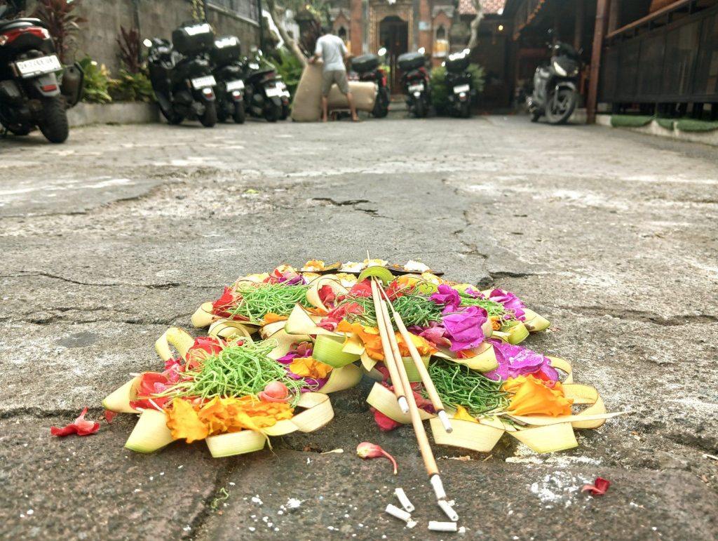 バリ島ツーリング3日目の朝。ホテルの前には、バリ島に行くと必ず目にする「チャナン」が供えられていました。地面に置かれたお供えものは悪霊に対するお供えもので「悪いことしないでくださいね」という意味が込められているそうです。