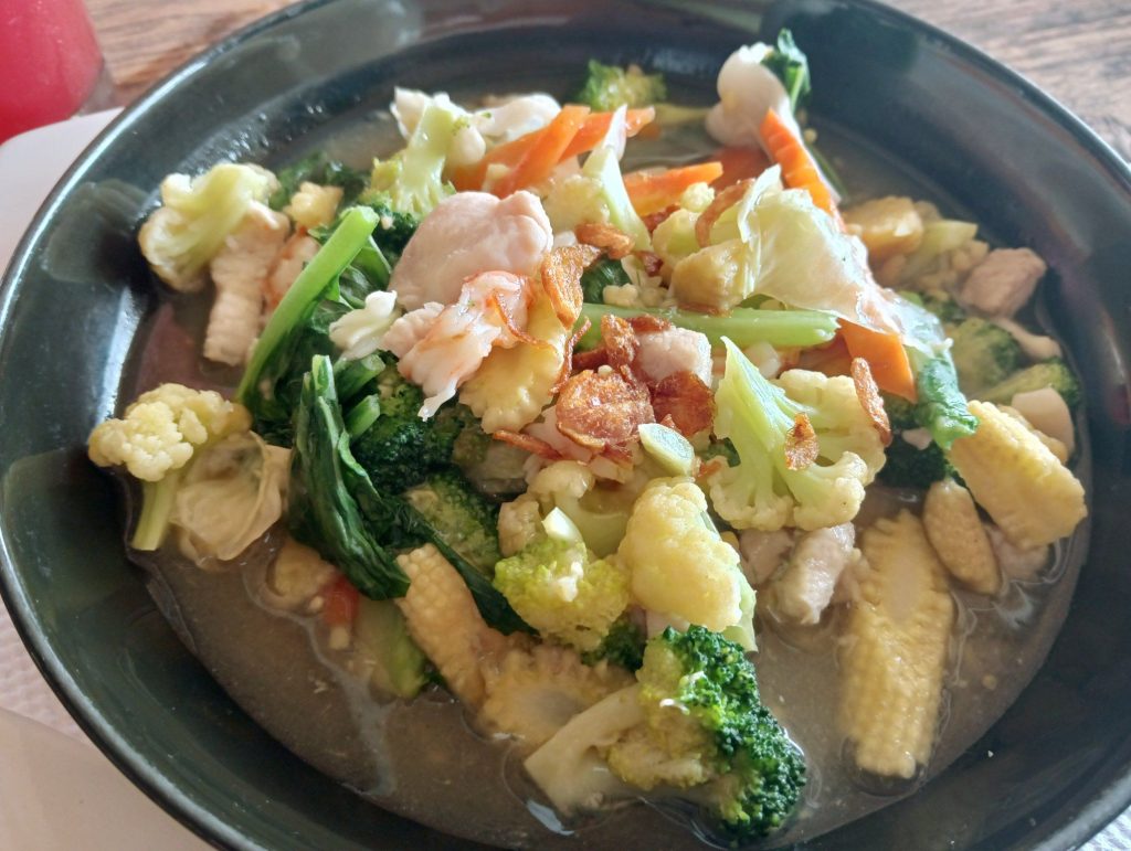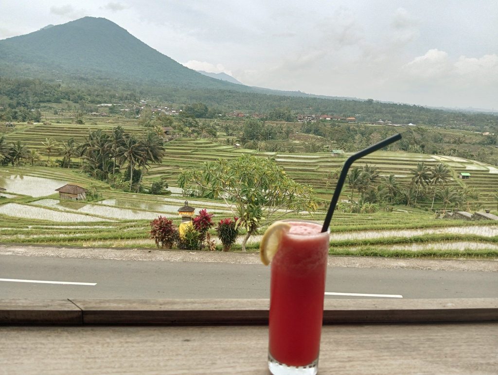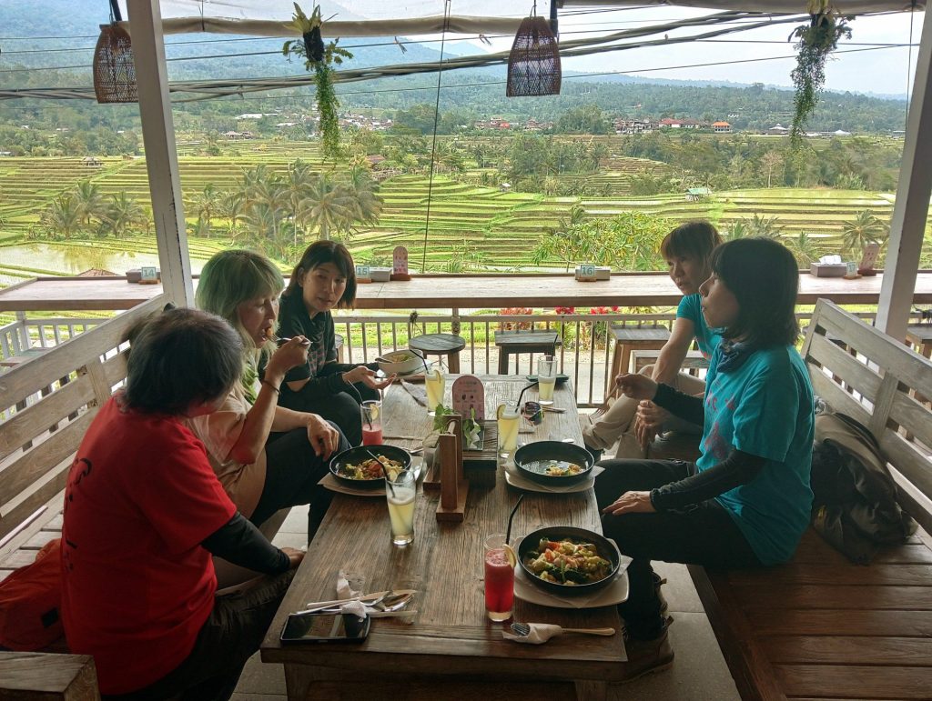 ライステラスを見渡せるカフェで、野菜たっぷり料理チャプチャイとスイカジュースをいただきました。インドネシア版の八宝菜のような料理です。