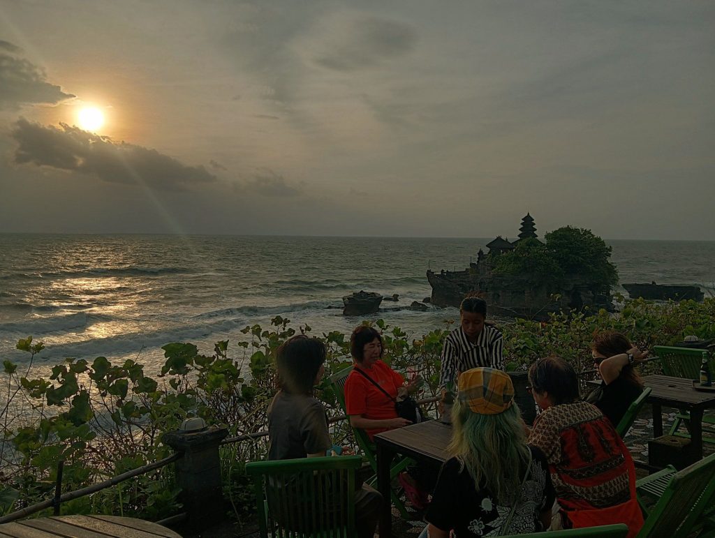 「タナロット寺院で見る夕日」が見たかったのですが・・薄っすらと雲が出て、イマイチな夕日でした(^-^; ちゃんとビーチサイドのテーブルもあるのですが、風が強くてグラスがひっくりかえるので、屋内のレストランに移動。