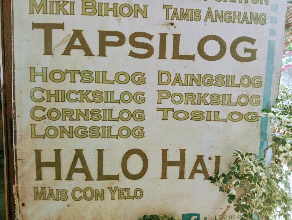 なんとか目的地に到着!ホテルのすぐ手前の食堂でランチです。メニュー表には全然わからないメニューが並び、その中でひときわ目立つのが「ハロハロ」。おお!この店でもデザートにハロハロが食べられそうです。