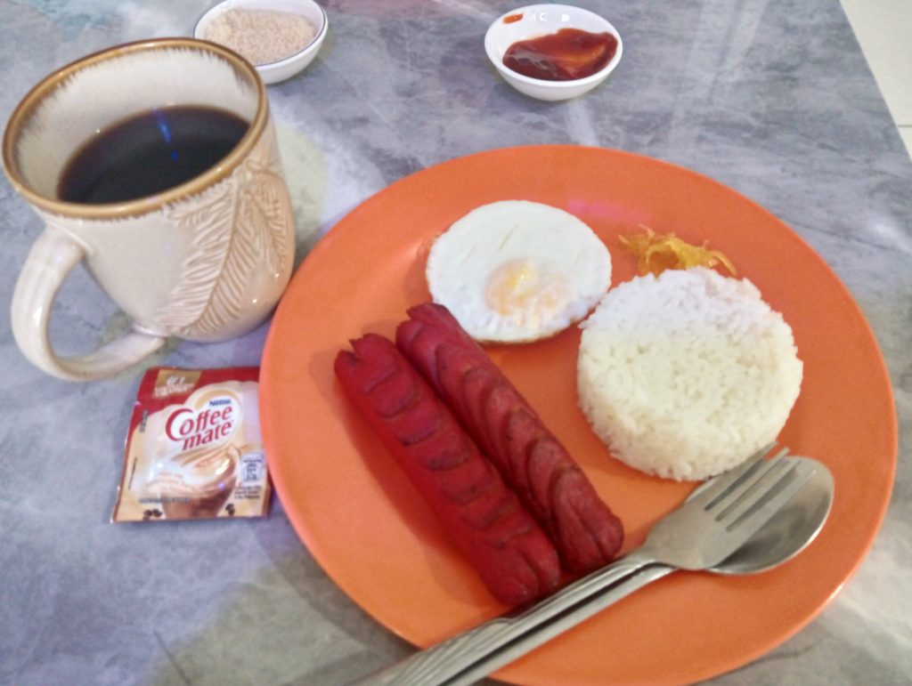 ホテルの最上階から町を見下ろしています。見ていて全然飽きません。今日の朝食はシンプル。ホットドッグを頼んだら、ご飯とソーセージが出てきました🤣