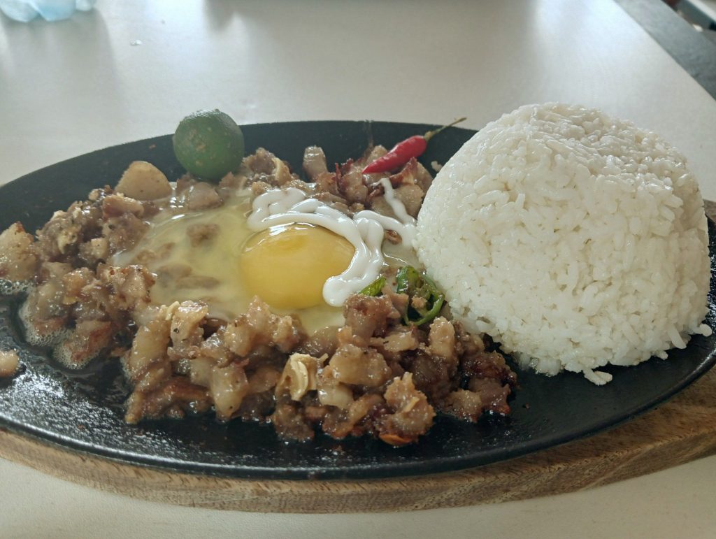 今回、チャレンジしたのは「シシグ」と呼ばれる豚肉料理。豚の耳や豚バラを細かく刻んで甘辛く焼いた上に目玉焼き。ビジュアル的にも美味しそう。ちょっと油が多かったですが💦