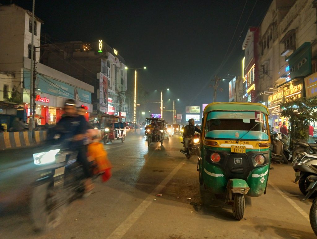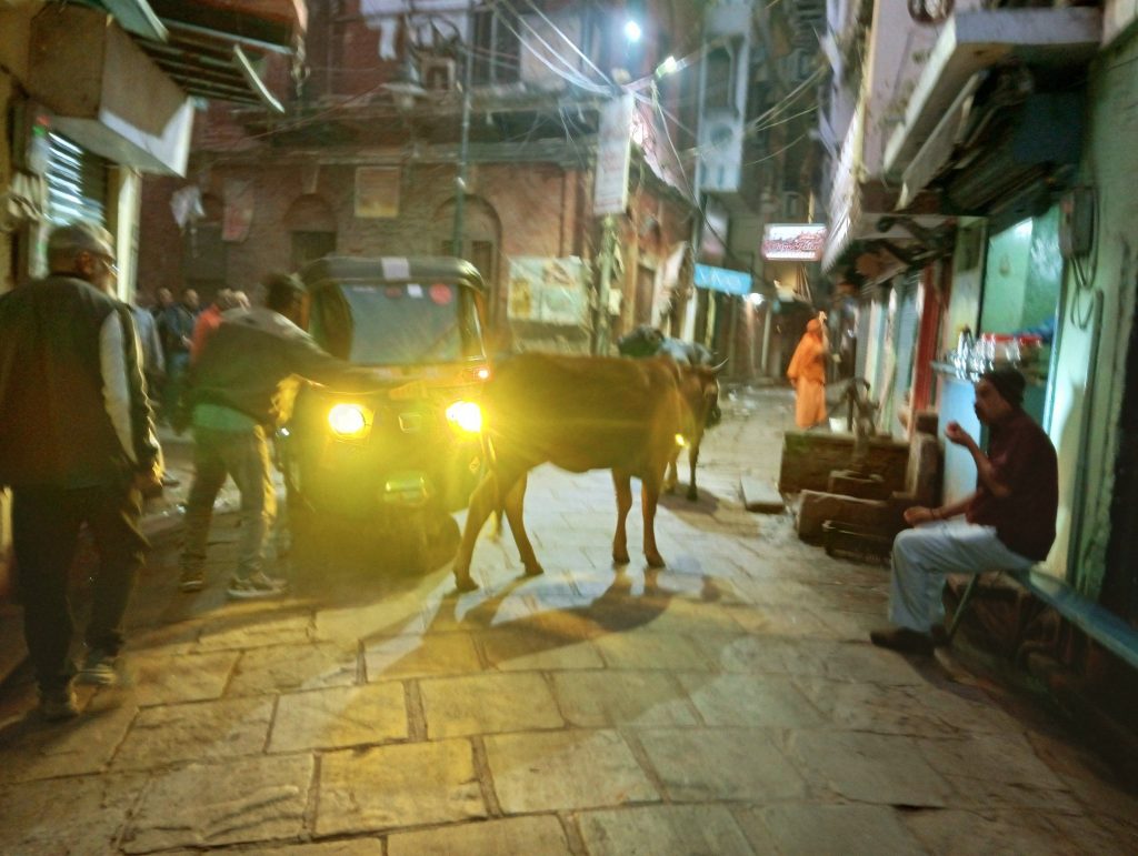 夜明け前のバラナシ。朝のガンジス川を見るために、まだ薄暗いバラナシ市街をトゥトゥクで駆け抜けていきます。