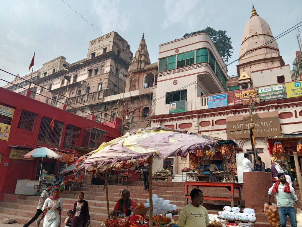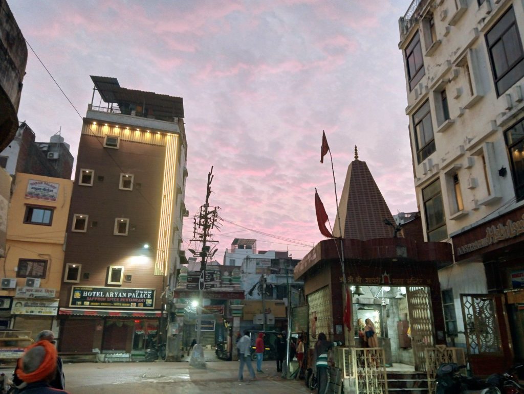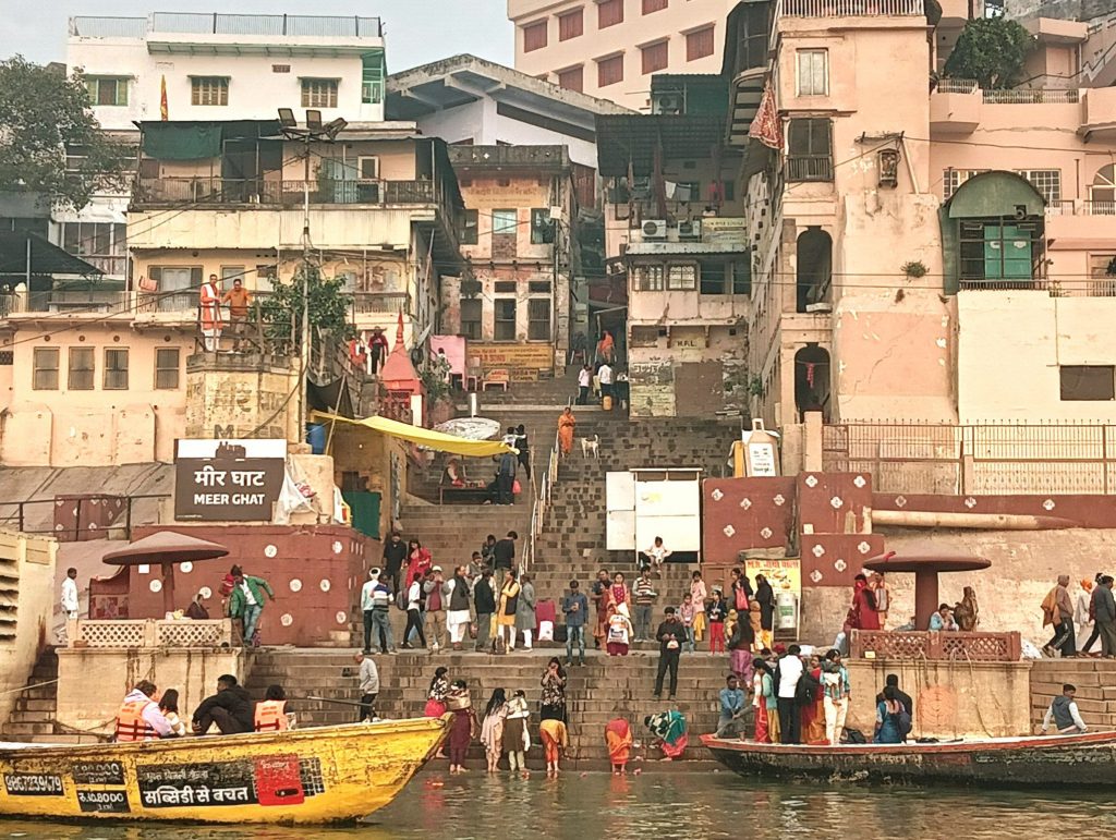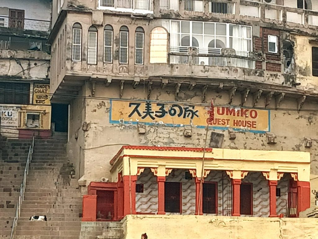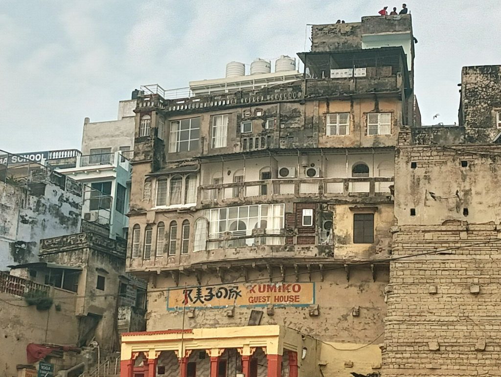ガンジス川の岸にはぎっしりと寺院や宿坊、ゲストハウスが立ち並んでいて、その建物のトンネルを抜けるようにしてガンジス川の川岸に出てきました。振り返るとピンクシティ・ジャイプールにあるようなピンク色の建物。私はガンジス川よりも、何気なく通り抜けてきたこの建物に感動しました。