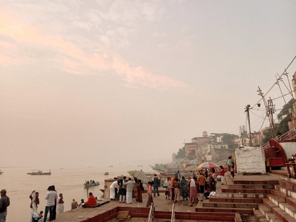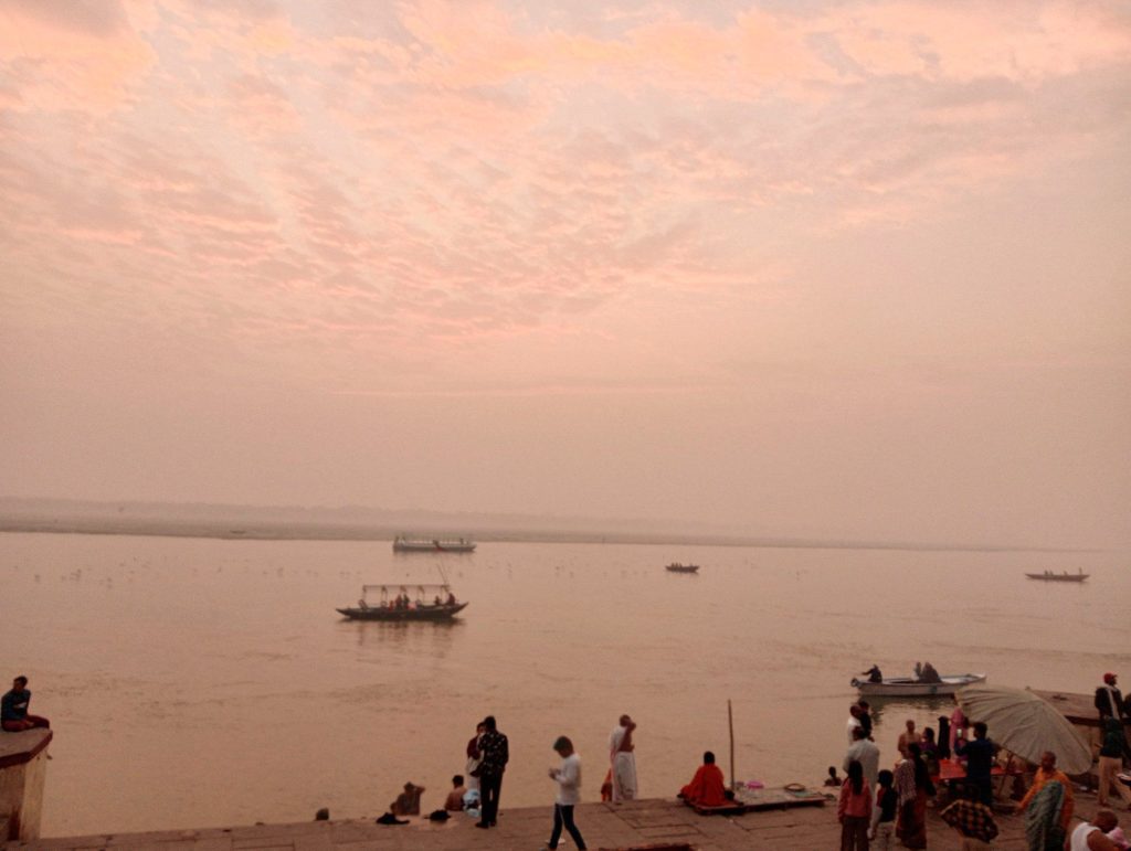 建物のトンネルを抜けると、目の前にガンジス川。空はピンクに染まり、川面も同じようにピンク色。ガンジス川は静かに流れていました。