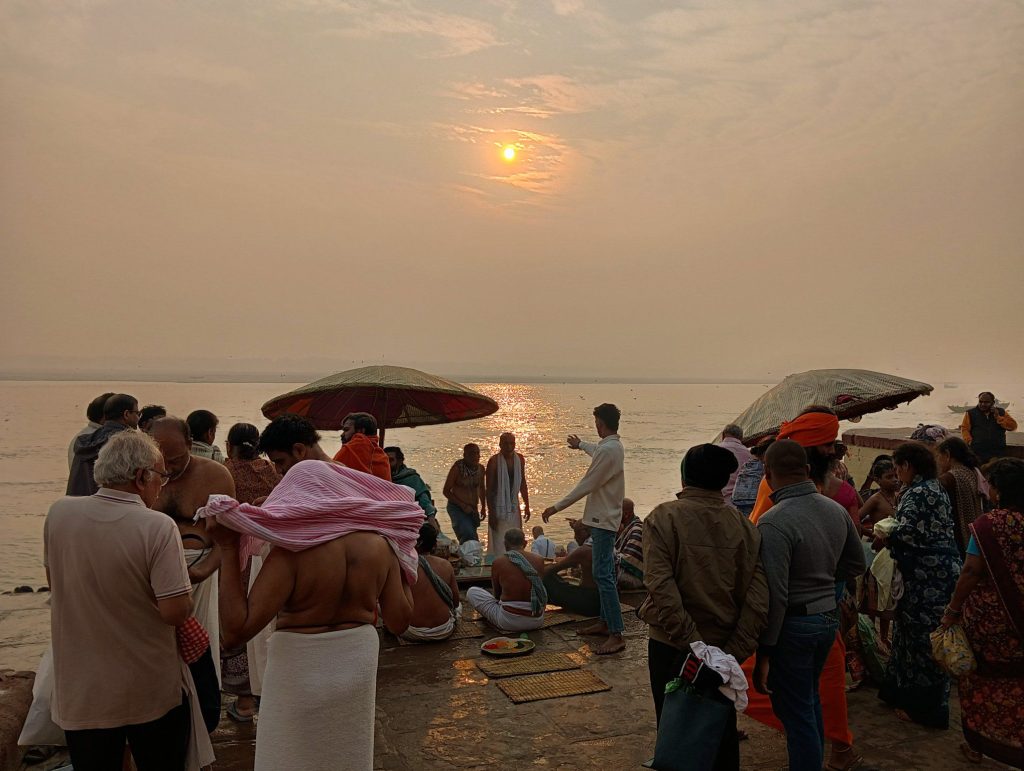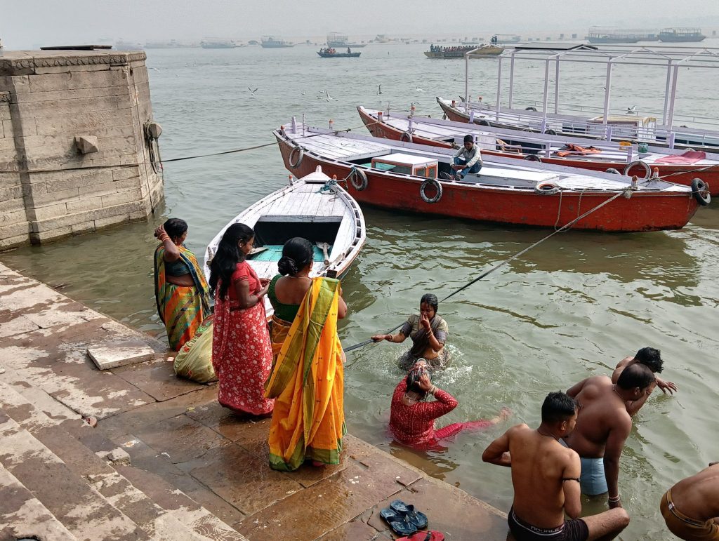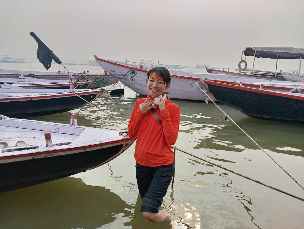 朝は寒かったですが、昼は気温が上がって私たちでも川に入れそう。朝は神聖な空気が漂っていましたが、昼はインド各地からやってきたインド人旅行客も楽しそうに、それこそキャッキャと騒ぎながら沐浴を楽しんでいました。 かなえさんは足だけ沐浴🤣 私はお客様と一緒に全身沐浴チャレンジしました。(写真がなかった💦)