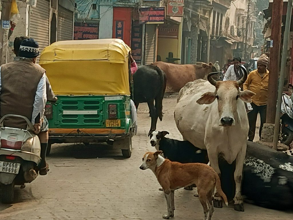一旦ホテルに帰って朝ごはん。本日は終日自由行動。町の散策も良いですが、やっぱりもう一度ガンジス川をゆっくり見てみたい!いや、沐浴もチャレンジしてみたい!ということで、迷路のような町を今度は歩いてガンジス川へ。やっぱり牛はそこら中にいます。途中で見かけたガネーシャの看板も面白い。「神様はこっちにいる」みたいな🤣