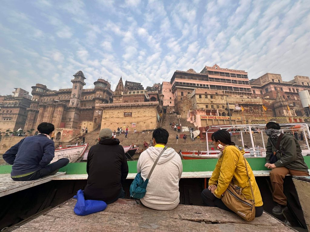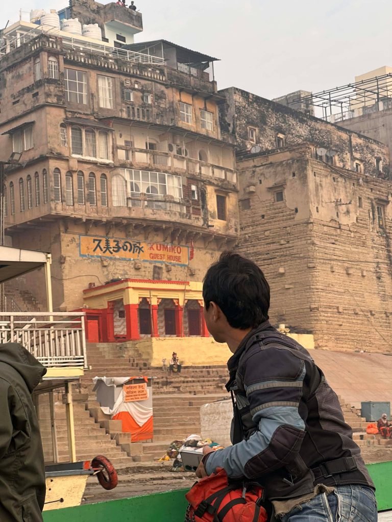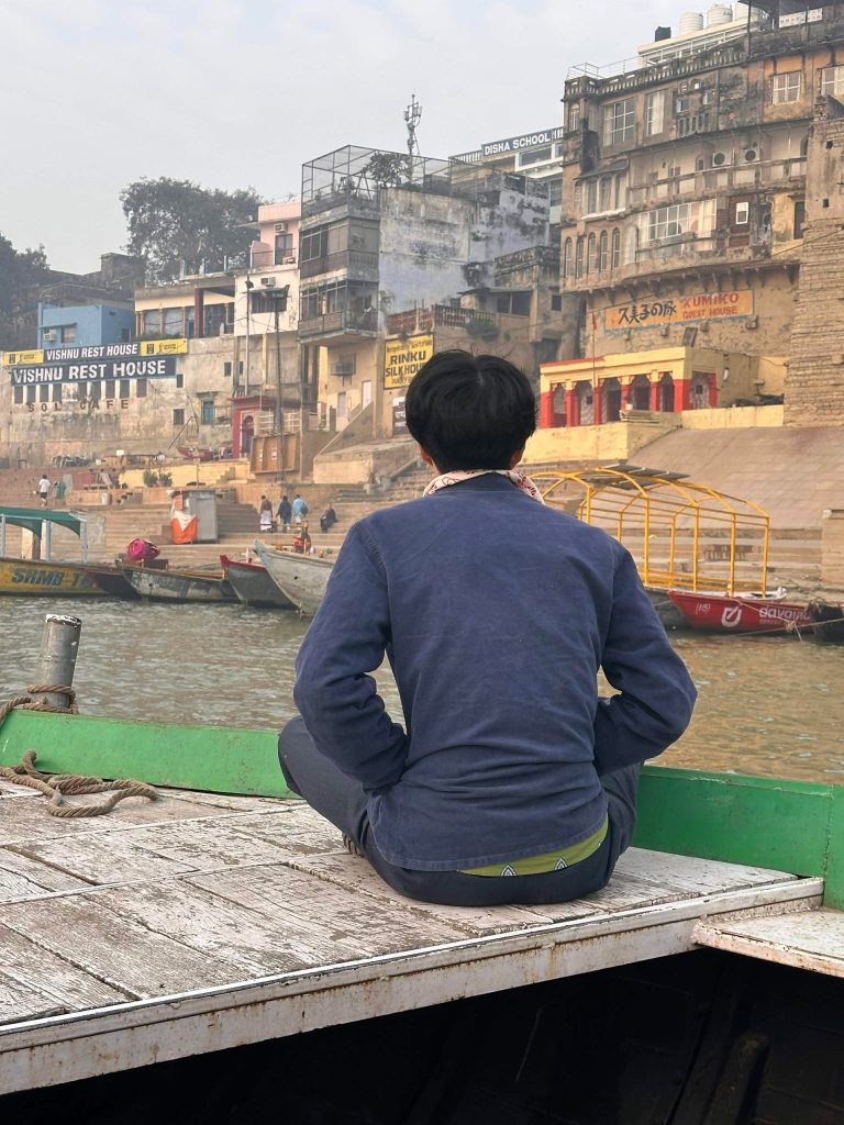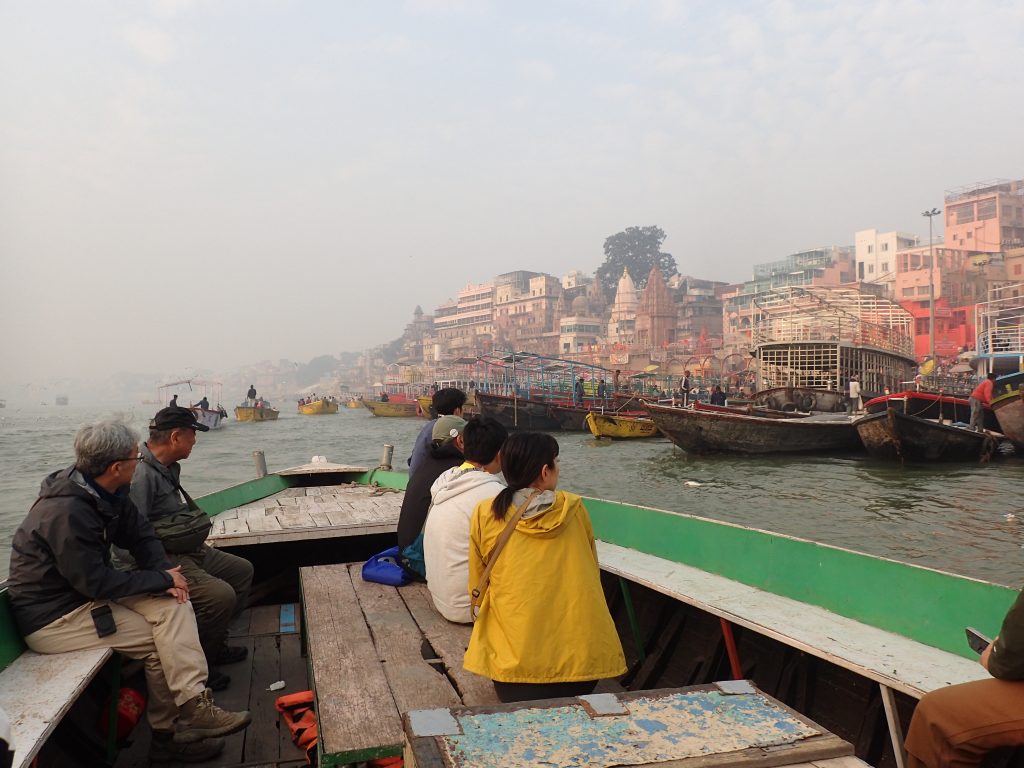 お客様に撮ってもらった写真。背中がいい感じ。 約1時間、静かにゆっくり、朝のガンジス川で時間を過ごしました。