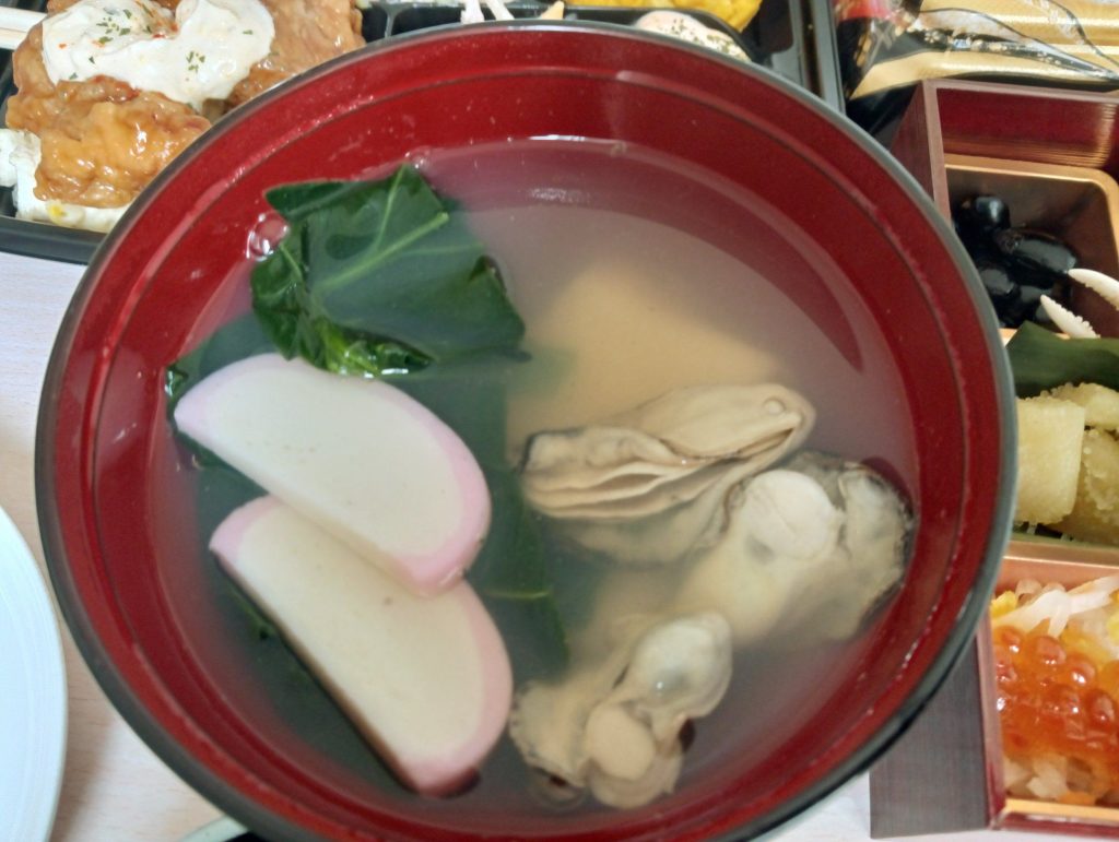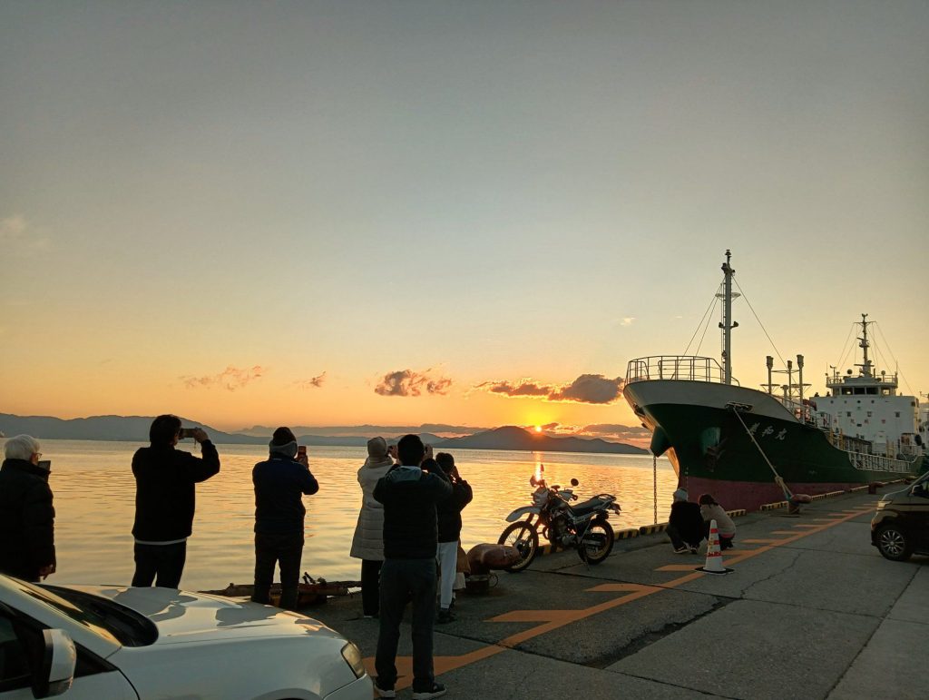 私はいつもの散歩コース、大竹港の岸壁から初日の出を拝みました。通常は釣り人しかいないこの岸壁も、さすがにこの日は夜明け前からずらっと車が並んで大賑わい。ご来光は宮島の南西に浮かぶ阿多田島(大竹市)から昇ってきます。そして牡蠣のお雑煮で正月を迎えました。