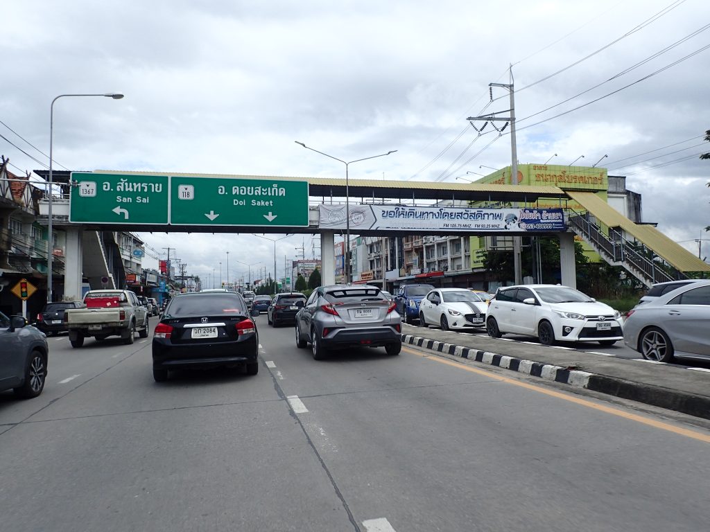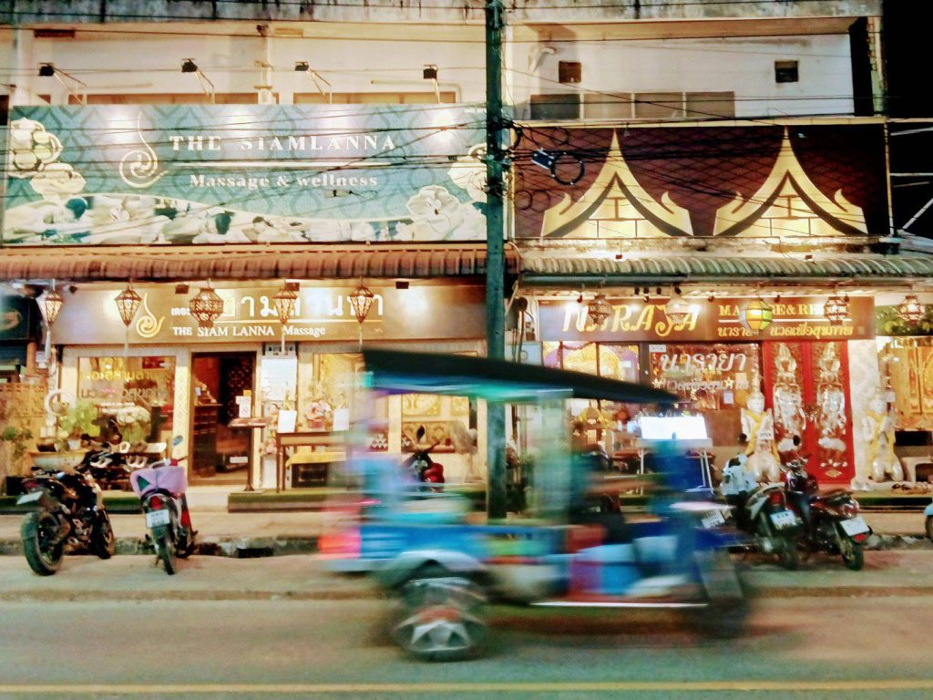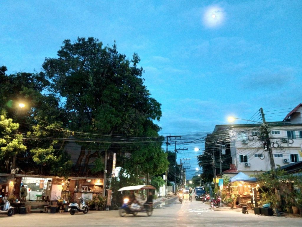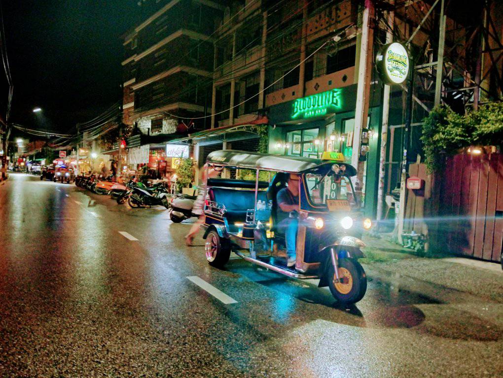 バンコクで飛行機を乗り継ぎ、チェンマイに到着。飛行機が少し遅れて、ホテルに到着したのは夜の21時頃。タイは乾季に入ったはずなんですが、雨季が長引いているような感じで、出発前に見た天気予報ではずっと雨模様💦到着したその日も雨でした。それでも、ホテル前のこの活気ある雰囲気。夜遅くでもトゥクトゥクが走りまわり、BARの前にサイドカー屋台が通りかかり、運転手のおばちゃんが何か叫ぶとBARの客は何かを注文している・・酒のツマミを買ったのか、野菜を買ったのかは不明ですが、いきなりアジアな世界が見れて楽しい夜です。