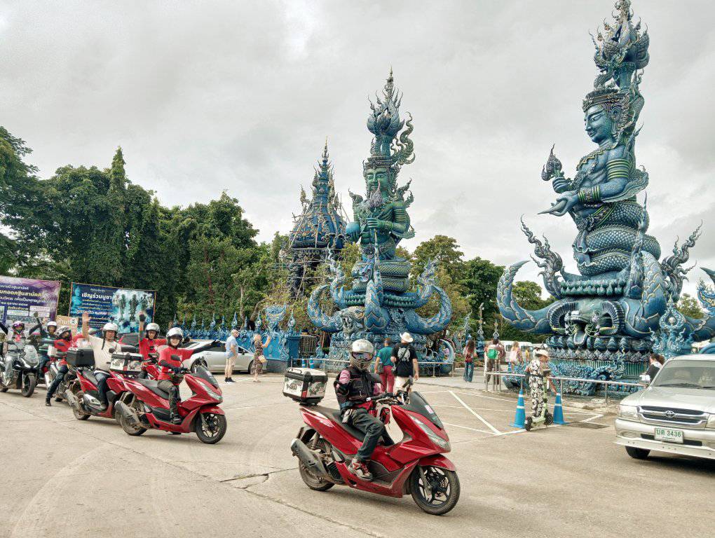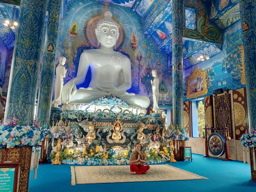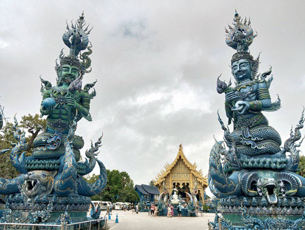 参加者のMさんが「町の出口に面白そうな寺院があるみたいです」とGoogleMapで見つけてくださり、立ち寄っていくことにしました。その名は「ワット・ローン・スア・テン」。昨日訪れたのは白い寺院「ワット・ロンクン」を作成した人の弟子が作ったお寺だそうな。この寺は「青色」がテーマです。