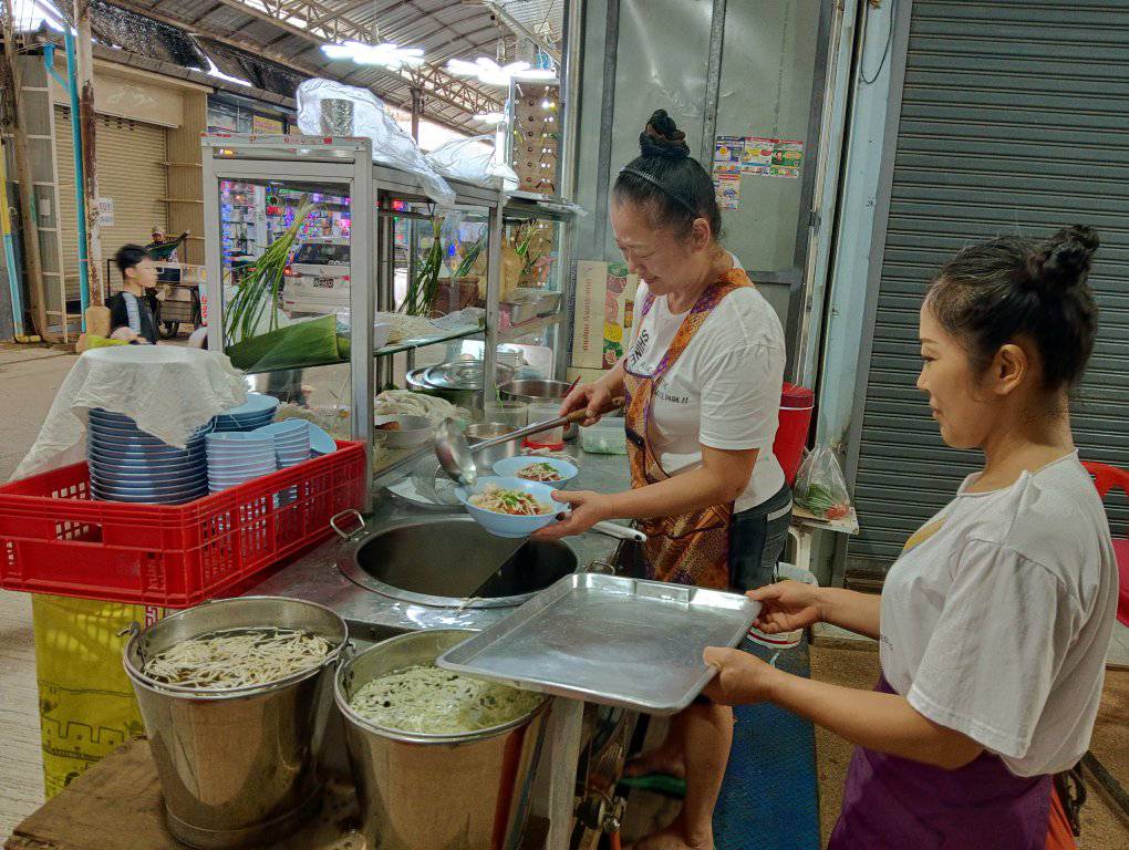 国境のマーケットにある食堂で、あっさりした麺料理のランチ。