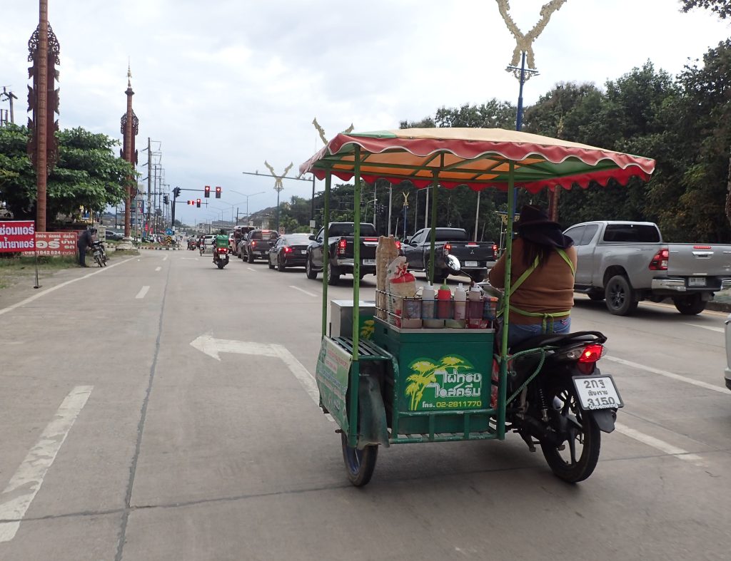 田舎はノーヘル率、高いです(^-^; このサイドカー式屋台もよく見かけます。日本でも走れないかなぁ?軽トラ屋台よりずっと身軽。お客様との商品やお金の受け渡しもバイクに跨ったままできるのがポイントです。
