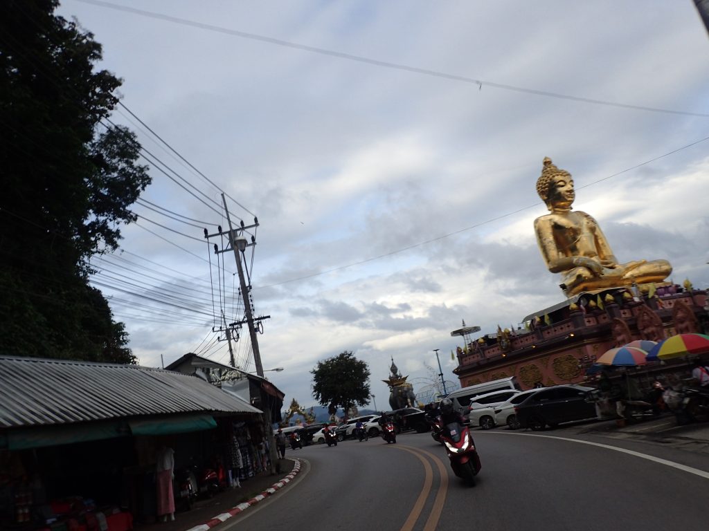 今日はまず、タイ最北端の地を目指します。町の中も寺院だらけですが、街道を走っていても派手なお寺をよく見かけます。いったいタイ全土にいくつお寺があるんでしょうか?最北端メーサイを示す標識にワクワクします。が、その前にガソリンスタンドに立ち寄って、何気なくGoogleMapを見たら、少数民族文化村のようなものがすぐ近くにあることを発見。時間に余裕があったので、立ち寄ってみることにしました。